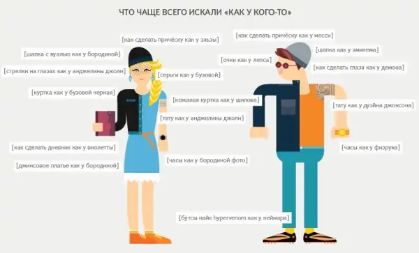 Например, в строках поиска появляются запросы: «купить бутсы как у Неймара», «косы как у Эльзы», «велосипед как у Кадырова» или «ремень для гитары как у Джона Леннона».