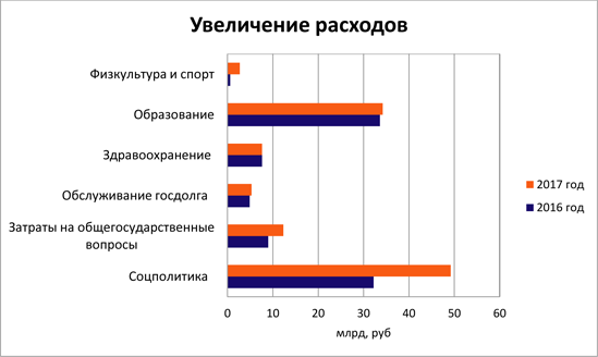 Некоторые статьи расходов, напротив, будут увеличены, причём зачастую резко. Например, по разделу «Физкультура и спорт» против 608 миллионов рублей в текущем году в 2017-м предполагается потратить 2,7 миллиарда рублей. Очевидно, что это связано со вступлением в финальную стадию подготовки Ростовской области к ЧМ-2018. Также будут увеличены расходы по разделу «Образование» — с 33,6 до 34,2 миллиардов рублей. «Здравоохранение» остаётся на том же уровне — около 7,6 миллиардов. Затраты на обслуживание госдолга вырастут с 4,9 до 5,3 миллиарда рублей; на общегосударственные вопросы — с 8,96 до 12,3 миллиарда.
