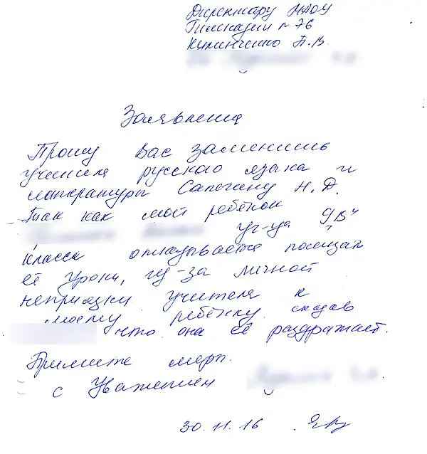 — Поэтому я вижу предвзятость в отношении меня. В унизительной форме директор настаивал на увольнении, доведя меня до нервного срыва. Я написала заявление об увольнении по собственному желанию. За три недели до меня подобным же образом была уволена учитель английского языка. После моего ухода двоечники снова стали троечниками, а все отличники вернулись, — говорит она.