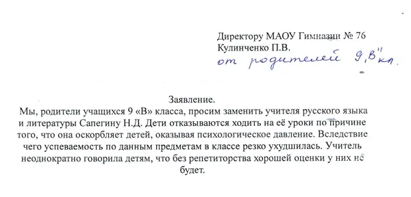 В Ростове разгорается скандал вокруг гимназии № 76, находящейся на улице Волкова, 5/6. Учительница русского языка и литературы Наталья Сапегина, проработав здесь менее полугода, была вынуждена уволиться. По её версии — из-за давления со стороны директора гимназии, которого не устраивало, что она отказывалась завышать оценки ученикам ради благополучной отчётности. По версии же директора, Сапегина не соответствовала занимаемой должности, на неё поступало множество жалоб от родителей учеников, из-за чего в итоге и пришлось расстаться.