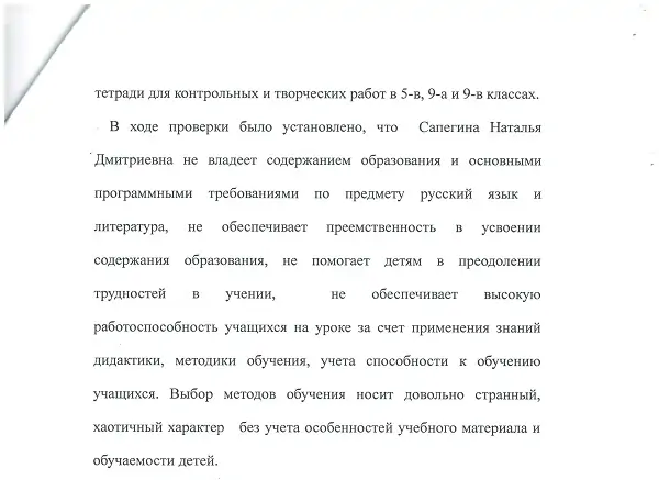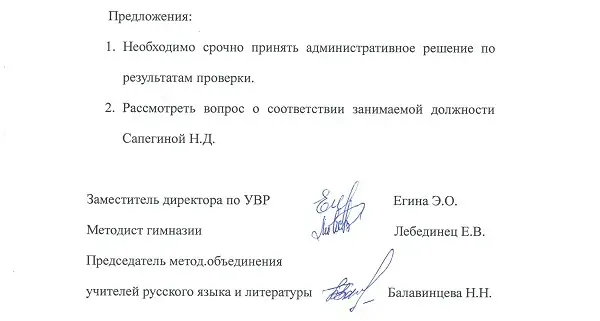«В ходе проверки было установлено, что Сапегина Наталья Дмитриевна не владеет содержанием образования и основными программными требованиями по предмету русский язык и литература, не обеспечивает преемственность в усвоении содержания образования, не помогает детям в преодолении трудностей в учении. Выбор методов обучения носит довольно странный, хаотичный характер без учёта особенностей учебного материала и обучаемости детей», — говорится в документе. На основании всего этого предлагается рассмотреть вопрос о соответствии Натальи Сапегиной занимаемой должности.