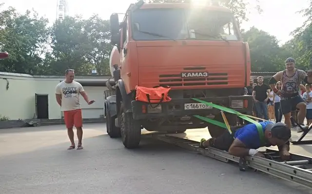 Самым зрелищным моментом шоу, безусловно, стала некая современная интерпретация «бурлаков на Волге». По очереди силачи накидывали через плечи тросы и тянули на себе 18-тонную бетономешалку. Кому-то удавалось лишь едва её сдвинуть, но большинство, напрягая каждый мускул своего тела, тащили «Камаз» за собой более метра.
