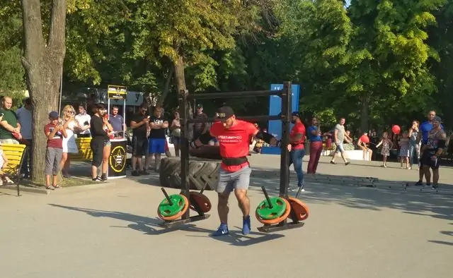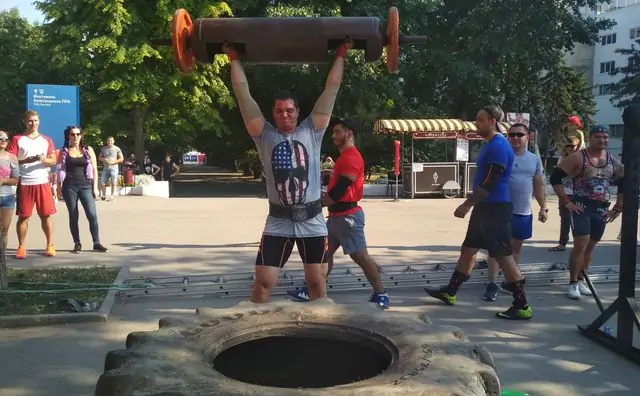 А затем один за одним они переворачивали 400-килограмовое колесо от большегруза и носили на плечах «коромысло» весом в 260 килограммов.