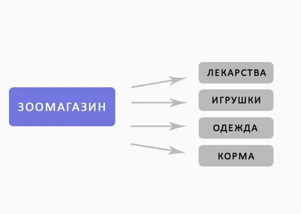 Тип товара – для зоомагазина из примера – это корма, игрушки, лекарства, одежда. А в магазине одежды это будут – верхняя одежда, сумки, обувь итп.
