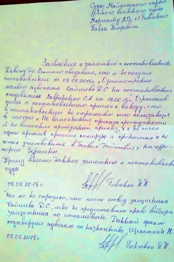«Ознакомившись с постановлением, пришел к выводу, что в постановлении не отражены мои показания в части «невыполнения приказа». Я не выполнял преступный приказ, так как не хотел идти против присяги, которую я принимал, и не хотел участвовать в боевых действиях на территории Украины. Прошу внести данное замечание в постановление суда», — написал Тынченко.