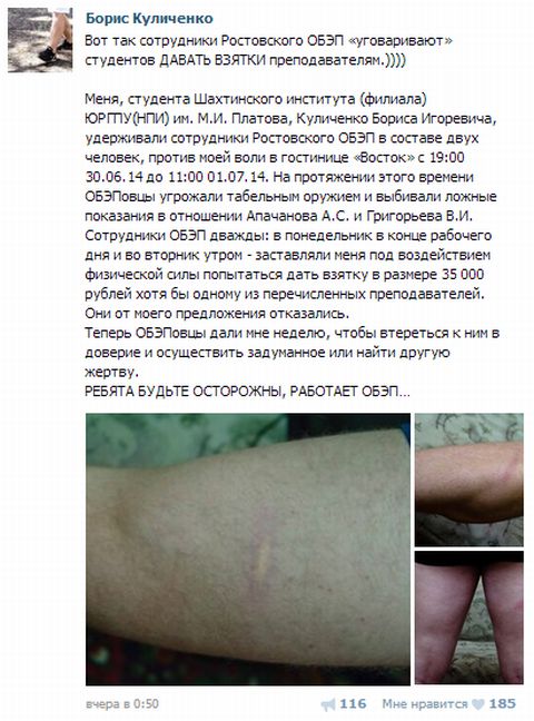 «Меня, студента Шахтинского института (филиала) ЮРГПУ (НПИ) им. М.И. Платова, Куличенко Бориса Игоревича, удерживали сотрудники Ростовского ОБЭП в составе двух человек, против моей воли в гостинице «Восток» с 19:00 30.06.14 до 11:00 01.07.14. На протяжении этого времени ОБЭПовцы угрожали табельным оружием и выбивали ложные показания в отношении Апачанова А.С. и Григорьева В.И. Сотрудники ОБЭП дважды: в понедельник в конце рабочего дня и во вторник утром - заставляли меня под воздействием физической силы попытаться дать взятку в размере 35 000 рублей хотя бы одному из перечисленных преподавателей. Они от моего предложения отказались», написал студент.