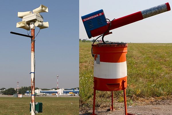 В помощь своему пернатому отряду сотрудники применяют и средства звукового отпугивания: биоакустические установки, транслирующие тревожные крики птиц, звуковые пропановые пушки, имитирующие звуки выстрелов, мощностью до 130 дБ; а также зеркальные отражатели.