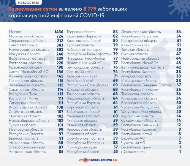В России число заразившихся достигло 502 436 человек. За сутки эта цифра выросла сразу на 8779 (сутками ранее было +8404). За последние 24 часа в России скончались 174 пациента. Всего по стране с начала эпидемии зафиксированы 6532 смертельных исхода.