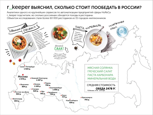 Аналитики одного из крупнейших сервисов по автоматизации предприятий сферы HoReCa r_keeper подсчитали, во сколько россиянам обходятся стандартные обеды вне дома. Объектом исследования стали более 60 тысяч мест общепита из 15 городов-миллионников — Москвы, Санкт-Петербурга, Новосибирска, Екатеринбурга, Нижнего Новгорода, Казани, Челябинска, Омска, Самары, Ростова-на-Дону, Уфы, Красноярска, Перми, Воронежа и Волгограда.