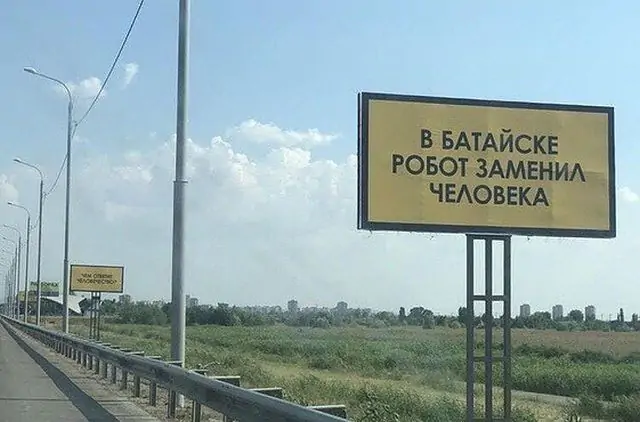 Надпись на первом билборде гласила: «В Батайске робот заменил человека», на втором — «Чем ответит человечество?», на третьем — «Подъем пенсионного возраста! И это всё?!». Вскоре третий баннер закрасили неизвестные.