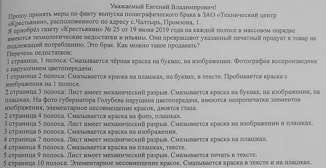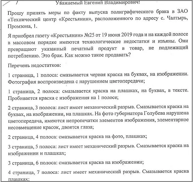 По словам генерального директора Технического центра «Крестьянин» Александра Васильева, после того как типография была закрыта, руководство получило возможность ознакомиться с материалами дела. Оказалось, что жалоб было две. Одну написал 1 июля таганрожец, вторую три недели спустя — ростовчанин. Примечательно, что жалобы, как рассказала Ирина Самохина, оказались идентичны вплоть до запятой и ошибок.