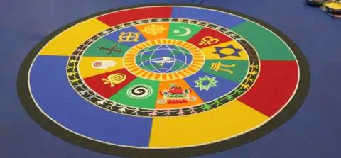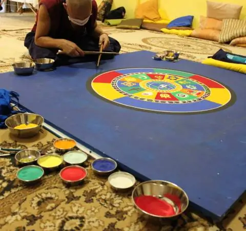 Руководитель клуба пояснила, что в центре любой мандалы обязательно строится дворец, в который после ритуалов приглашают пожить божество. Перед разрушением мандалы божество просят покинуть дворец.