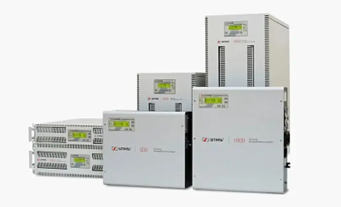 Работают по принципу двойного преобразования. При нем на входе переменное напряжение изменяется в постоянное. Затем инвертор проводит обратное преобразование от постоянного к переменному. Это позволяет установить стабильную и чистую синусоиду с точностью в 1%, погасить помехи основной электросети. Некоторые модели могут работать от батареи до нескольких десятков часов, что позволит восстановить основную электросеть.Плюсы.