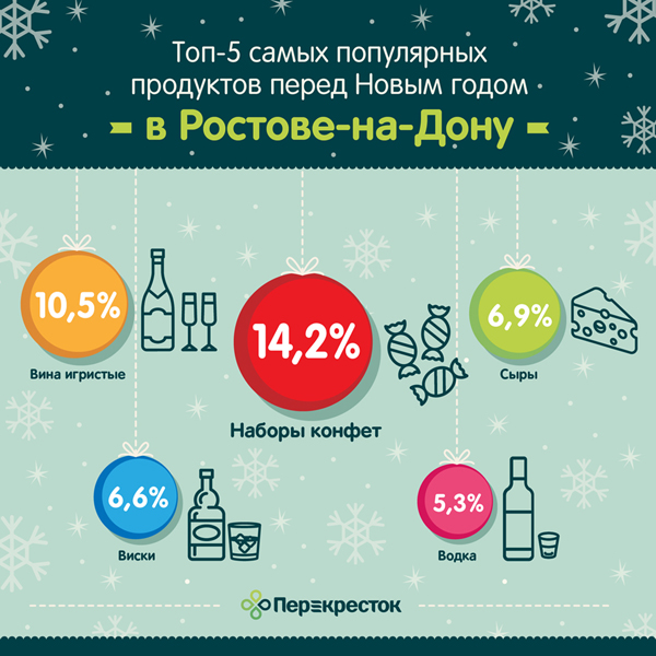 Выяснилось, что в топ-5 обязательных атрибутов новогоднего стола ростовчан входят наборы конфет (14,2%), вина игристые (10,5%), сыры (6,9%), виски (6,6%) и водка (5,5%).