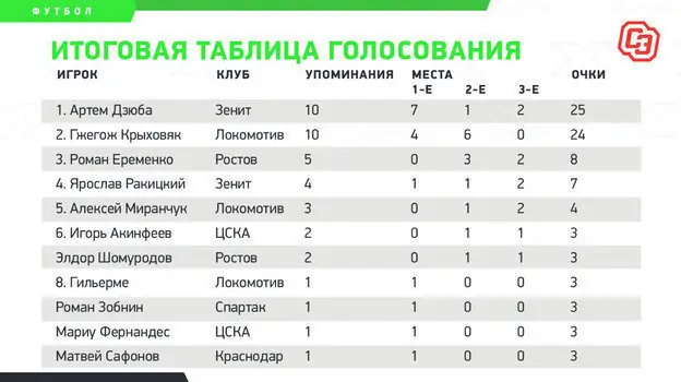 В итоге наибольшее количество очков (25) набрал нападающий «Зенита» и сборной России Артём Дзюба. На втором месте с минимальным отрывом оказался хавбек «Локомотива» Гжегож Крыховяк (24 балла). Третье место с большим отрывом занял полузащитник «Ростова» Роман Ерёменко (8 баллов).