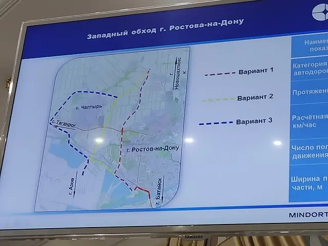 Два других варианта Западного обхода проходят за чертой Ростова, однако они ещё «в стадии проработки и требуют детального анализа». Но исходя из показанного министром рисунка понятно, что вариант № 2 не отличается кардинально от первого, а вариант № 3 является самым протяжённым, так как предполагает обход ещё и Чалтыря.