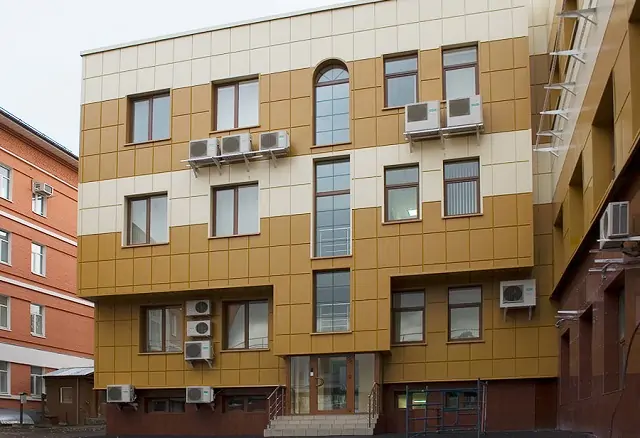 Второй вариант — керамогранит. Он более долговечен, однако и стоит на порядок больше. Плюс сами плиты тяжёлые, что усложняет как их доставку, так и монтаж. Из-за большого собственного веса у этого материала есть и проблемы с надёжностью крепления к фасадам.