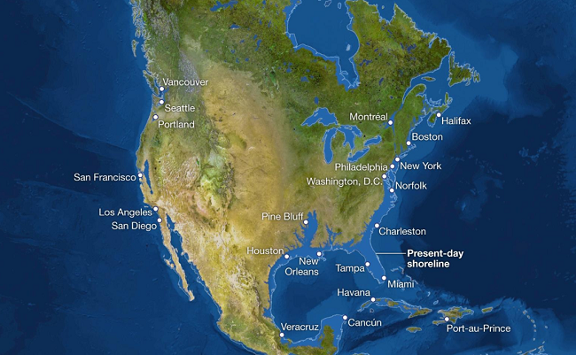 Западное побережье Северной Америки также пострадает не сильно. Зато восточное уйдёт под воду практически полностью, а это города Вашингтон, Филадельфия, Нью-Йорк и весь штат Майами.