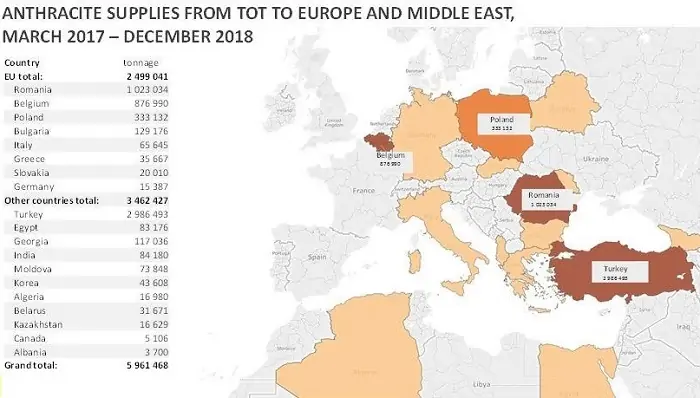 География поставок донбасского угля самая обширная. Европа и Турция — основные покупатели, отмечается в исследовании. Согласно документу, Турция с марта 2017-го по декабрь 2018-го купила почти 3 млн тонн этого угля. Второй по объёмам оказалась Румыния — 1,02 млн тонн, третьей — Бельгия — 876 990 тонн. За ними следуют Польша (333 132 тонны) и Болгария (129 176 тонн).