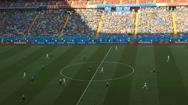 9-я минута. На стадионе довольно много пустых мест, будет интересно послушать, сколько человек из 42 тысяч посетили игру. Билотов в продаже не было.