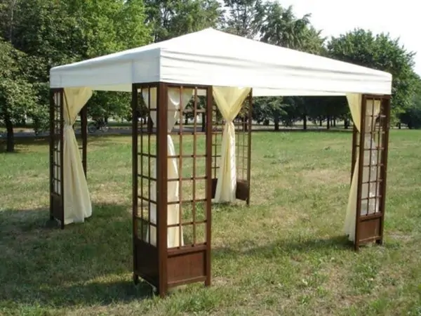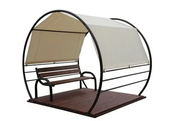 - шатер-беседка — стационарные модели с усиленным каркасом, которые могут быть дополнены бортиками, стенками, дверным проемом и даже окнами. Такие модели комплектуются москитными сетками и могут продаваться вместе с набором мебели и подушек для отдыха;