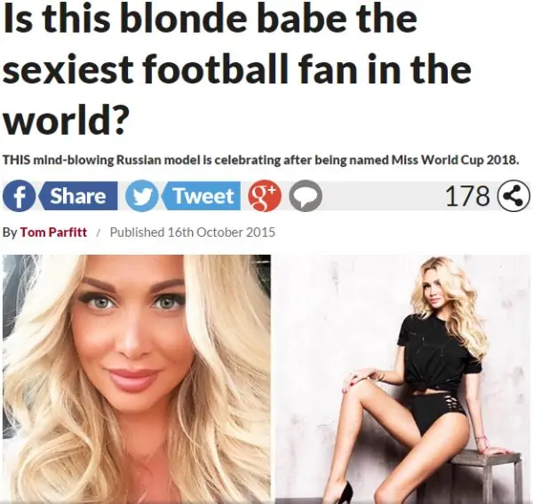«Возможно, эта модель является самой сексуальной футбольной болельщицей в мире?» — под таким названием 16 октября вышел материал в британском издании Daily Star. Кроме этого, известную российскую телеведущую Викторию Лопырёву британцы назвали лицом чемпионата мира по футболу 2018 года, который пройдёт в России.