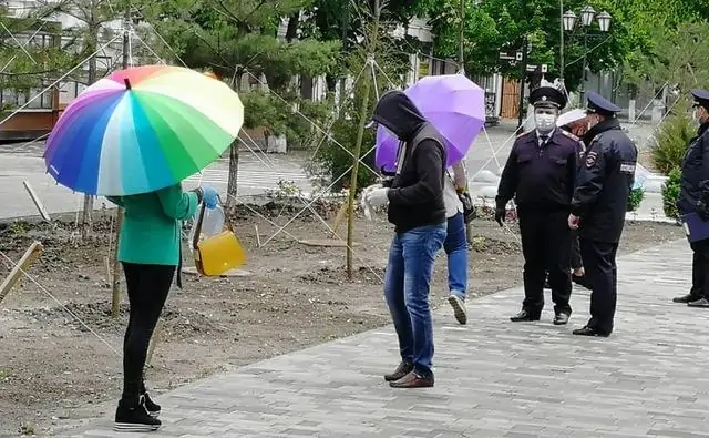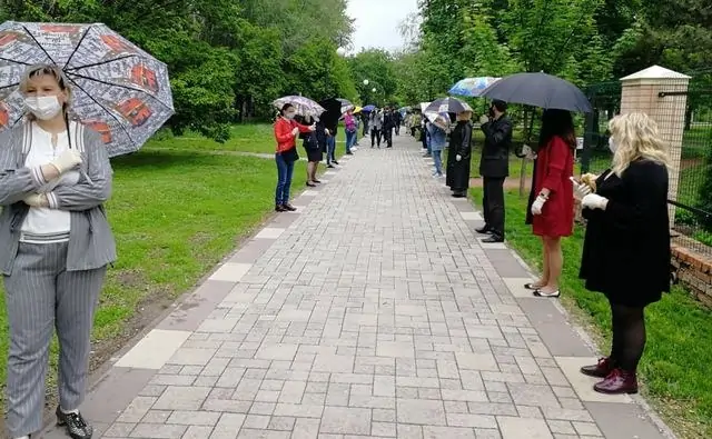 Азовчане выстроились в живую очередь от храма в сторону центра города, соблюдая интервал в 2,5 метра. Людям надлежало открыть зонты в знак защиты главы администрации. Участники флешмоба надели медицинские маски по самые глаза, однако перчатками снарядился не каждый.