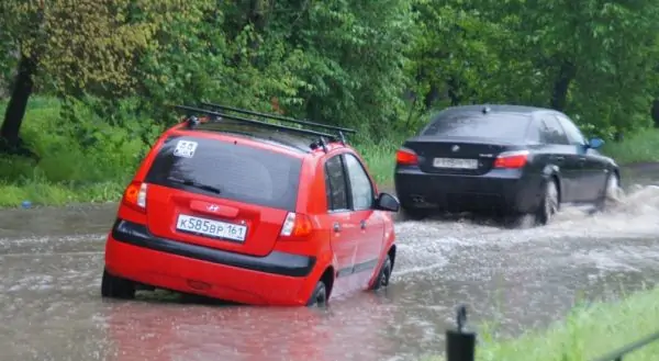 В Батайске недалеко от школы № 4 на Белорусской во время ливня, который шёл в Ростовской области 15 мая, все ямы на проезжей части скрылись под водой. Водитель «ВАЗ», по всей видимости, не знал о возможных ловушках на дороге и угодил в одну из ям передними колёсами.