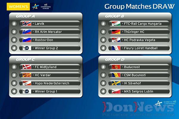 В Вене завершилась жеребьёвка группового турнира Лиги чемпионов среди женских команд сезона 2015/2016. Российский гандбольный клуб «Ростов-Дон» попал в группу «А». Соперницами донских красавиц стали гандболистки из Норвегии — клуб Larvik и Словении — RK Krim Mercator.
