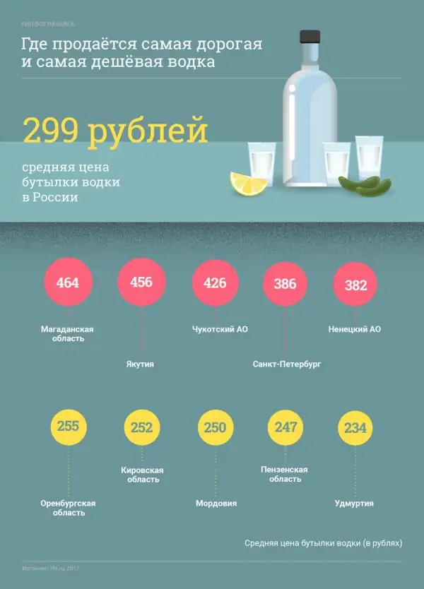 Портал «Лайф» составил рейтинг доступности водки по городам России. Оказалось, что самая высокая цена на сорокаградусный напиток в Магаданской области — в среднем 464 рубля за бутылку. В тройку регионов с самой дорогой водкой также вошли Якутия (456 рублей) и Чукотский автономный округ (426 рублей).