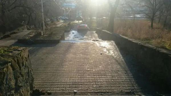 Необычное ДТП произошло в Ростове 2 декабря. Автомобиль Hyundai Accent скатился по лестнице в створе улицы Горького, ведущей к автовокзалу. Легковушка так и застряла на одном из лестничных пролётов.