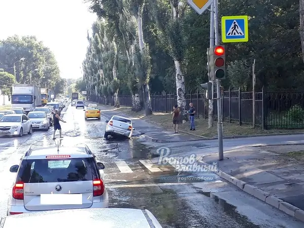 На пересечении улиц 1-й Конной Армии и 14-й линии в Ростове утром 27 июля в дорожную яму провалилась Lada Granta.