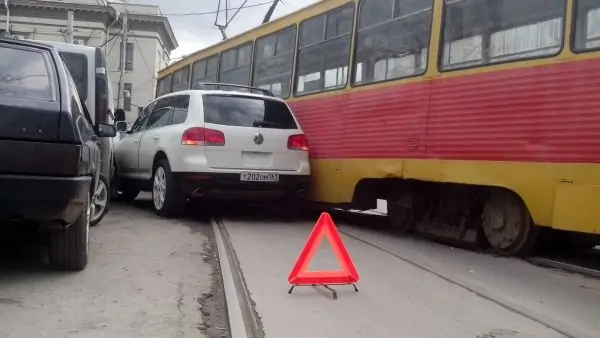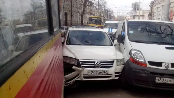 По информации очевидцев, водитель Volkswagen выехал на полосу встречного движения для обгона, не уступив дорогу трамваю, и застрял между ним и припаркованной машиной.