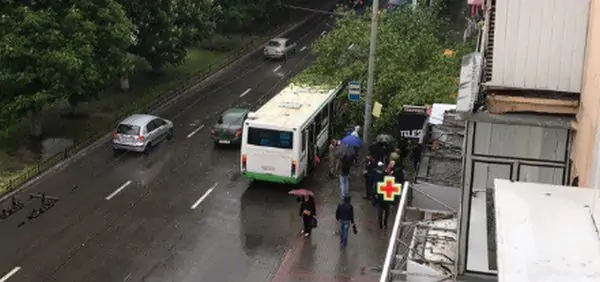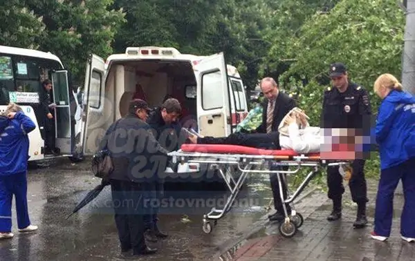 В понедельник, 15 мая, в Ростове на Ленина, 101, упал огромный тополь. Дерево раздавило автобусную остановку, на которой от дождя прятались люди. Кроме этого, тополь задел автобус с пассажирами.