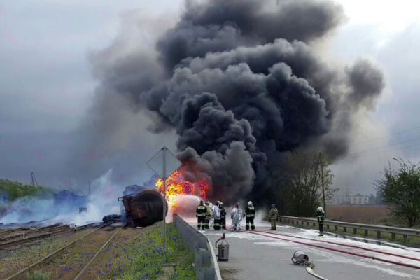 Утром в четверг, 28 апреля, сошли с рельсов и перевернулись две железнодорожные цистерны с битумом. Одна из них после опрокидывания загорелась.