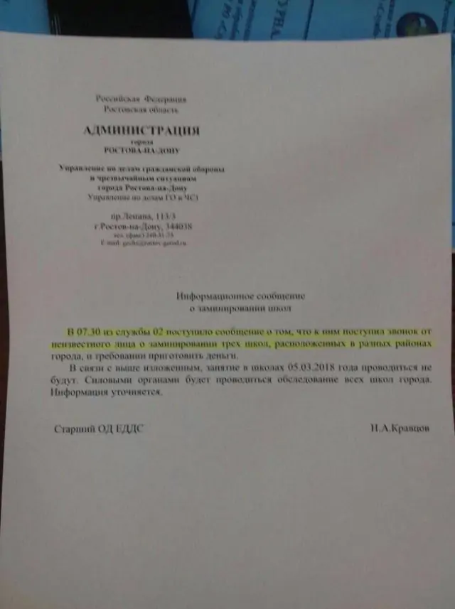 В администрации Ростова сообщили, что поступила информация о возможном заминировании трёх школ, но каких именно, звонящий не уточнил. Поэтому спецслужбы проверяют все школы Ростова.