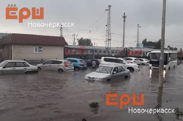 Ситуация с погодой неутешительная и в Новочеркасске. Там дождь не только буднично смыл асфальт, но и покусился на железнодорожный вокзал, сообщает «Ёрш. Новочеркасск». Из-за обилия осадков общественный транспорт и припаркованные машины пустились в свободное плавание.