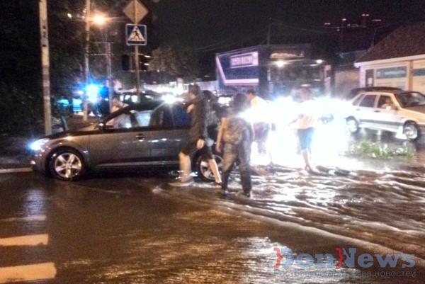 А в ста метрах от рухнувшего дома, на Текучёва, молодые люди организовали группу по спасению автомобилистов, угодивших в канализационные люки. Как пояснил один из добровольцев, при ливне вода в буквальном смысле выбила крышки люков (одна крышка весит почти 50 кг), и образовавшиеся ямы тут же угодили несколько машин, в том числе и машина скорой помощи. Её добровольцы также вытолкали из ямы.