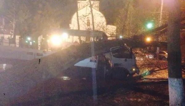 В обед 16 апреля коммунальщики распилили упавшее дерево на манипулятор. По всей видимости машина восстановлению не подлежит.