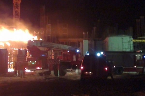 Через полчаса после доклада о ликвидации пожара на 22-й линии в ЦКС поступило сообщение о возгорании на улице Пойменной. Загорелась опалубка и строительные леса в строящемся корпусе торгового комплекса «Мегамаг».