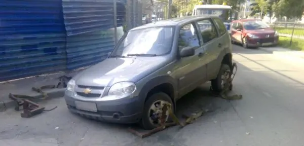 Как видно на фото, в яму угодило правое переднее колесо Chevrolet Niva. От этого машина приподнялась чуть ли не на дыбы.