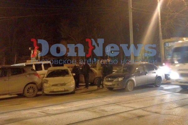 Как рассказали donnews.ru очевидцы ДТП, всё началось с того, что спускавшийся со стороны Горького трамвай № 4 врезался в Renault Logan. Машину развернуло, и она ударила сбоку стоявший автомобиль, пошла цепная реакция и образовалась куча-мала, в которую попали шесть автомобилей.