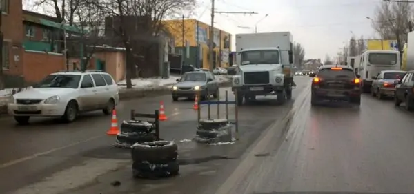 На фото видно, что кто-то, дабы предупредить водителей об опасности, огородил яму старыми автомобильными шинами. Но эта мера предосторожности вызывает сомнения — ночью их легко не заметить.