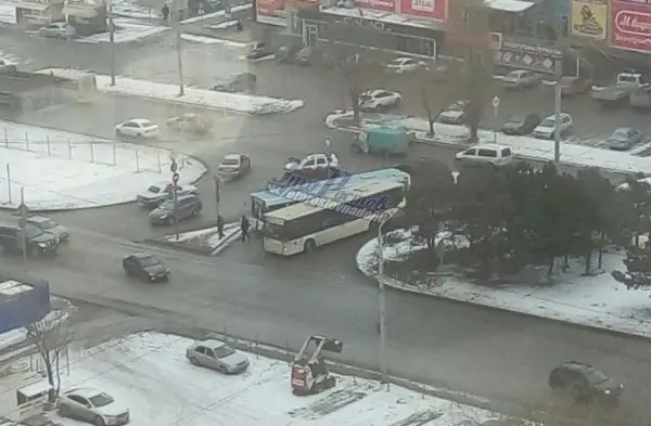 В Ростове на развороте с Малиновского на Ерёменко столкнулись два рейсовых автобуса с пассажирами, которые ехали по маршрутам № 67 и № 71. По словам очевидцев, ДТП произошло из-за того, что водители в борьбе за пассажиров решили устроить гонки на остановке. Результат — авария и две полностью перекрытые полосы движения.