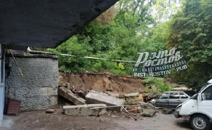 В Ростове на проспекте Стачки возле дома № 15 во время сильного ливня рухнула подпорная стенка. Как сообщили очевидцы в соцсети «ВКонтакте», упавшие бетонные плиты раздавили два автомобиля.
