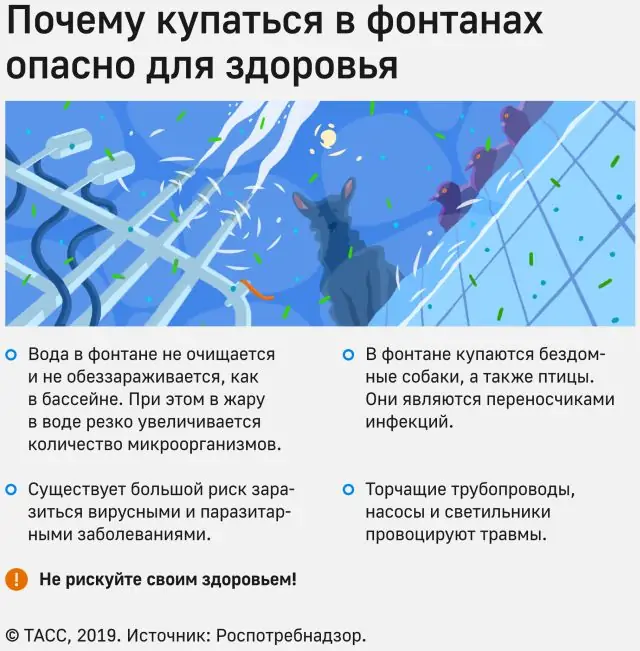 Купание в фонтане чревато не только простудой, уверяют в ведомстве, но и более серьёзными заболеваниями — кишечной и респираторной инфекциями, конъюнктивитами. Главную же опасность представляют энтеровирусные, ротавирусные инфекции и гепатит А.