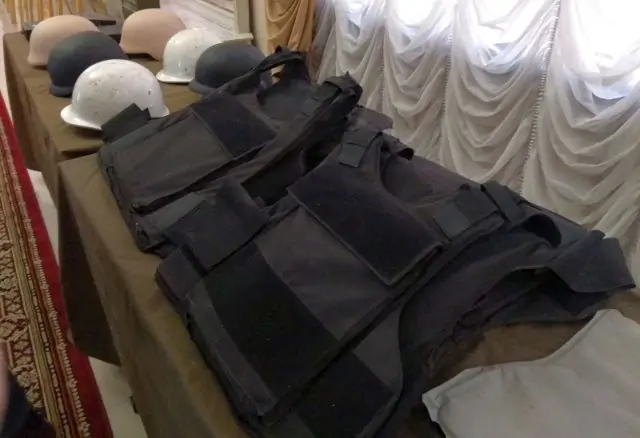 Ранее заявлялось, что на выставке будет представлено около ста экспонатов, в том числе беспилотный летательный аппарат, агитационные материалы и даже одежда боевика ИГИЛ*, Но, видимо, что-то пошло не так, и в Дом офицеров привезли только десятка три трофеев — оружие, самодельные миномёты, средства связи, каски и бронежилеты.