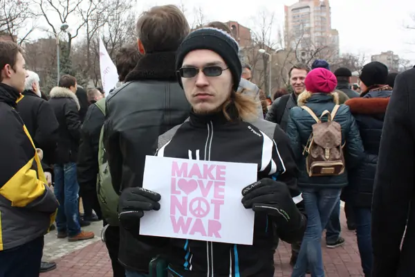 Неподалёку стоял молодой человек с бородой и любимым слоганом хиппи «Занимайся любовью, а не войной».