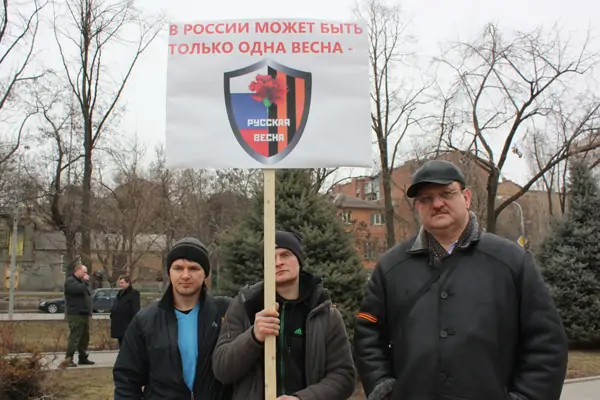 Тем временем за забором разворачивалась альтернативная акция. Молодые люди в тёмных одеждах, кое-кто даже в комуфляже, все с георгиевскими ленточками на груди или рукавах, кучковались неподалёку, поглядывая на митингующих. По другую сторону появился молодой человек с табличкой, утверждающей, что именно он представитель настоящей русской весны. На вопрос журналиста, что он тут делает, парень сообщил, что стоит в одиночном пикете. Тут же подоспел могучий мужчина и стал рассказывать, зачем на набережную пришли люди с георгиевскими ленточками.