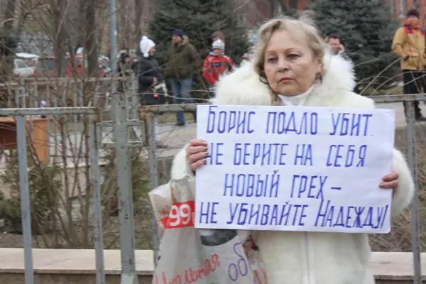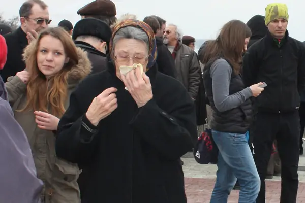 Пенсионерка, одетая в чёрное, сначала горько плакала у портрета убитого политика, вытирая глаза платочком, а потом развернула плакат, на котором чёрными буквами было написано, что тьма сгущается...